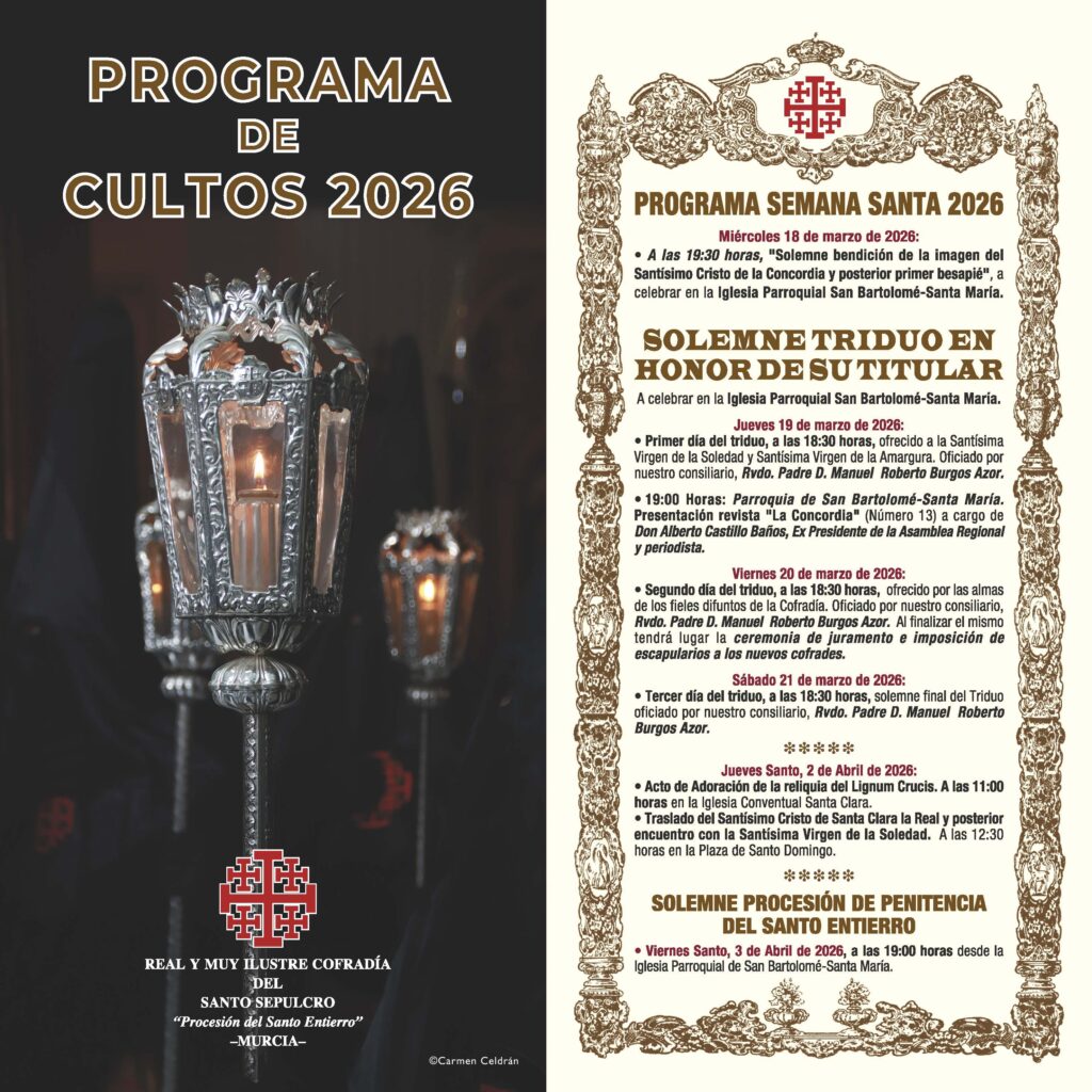 Desde la RyMI Cofradía del Santo Sepulcro de Murcia tenemos el gusto de compartirles el programa de cultos para la próxima Semana Santa.
